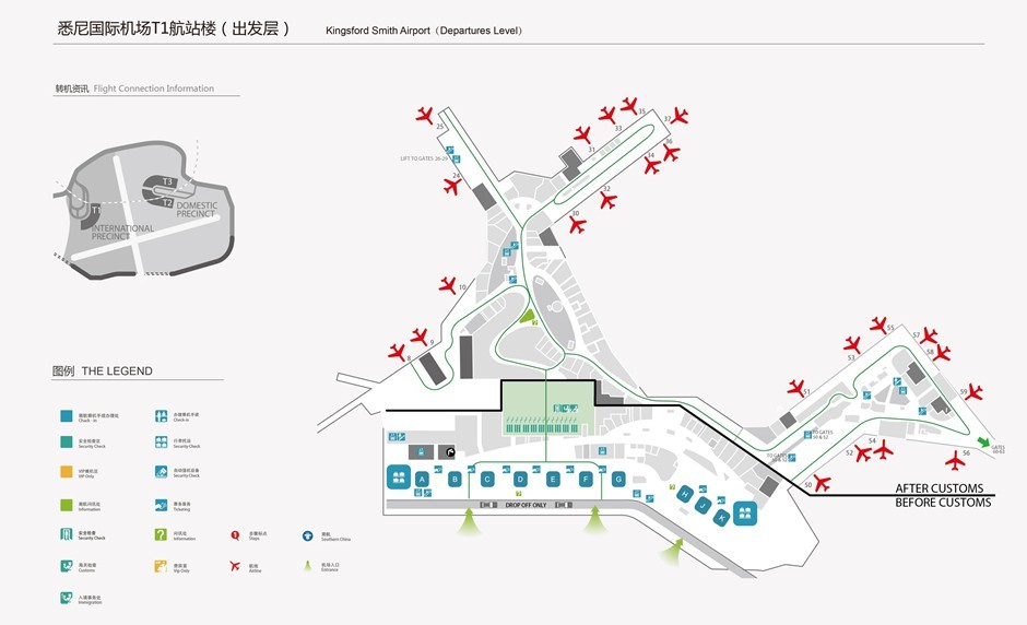 Kingsford Smith Airport (SYD) is both the largest and busiest international airport in Australia, 8km from downtown Sydney. The airport has three terminal buildings, among which T1 is for international flights which T2 and T3 are for domestic ones.